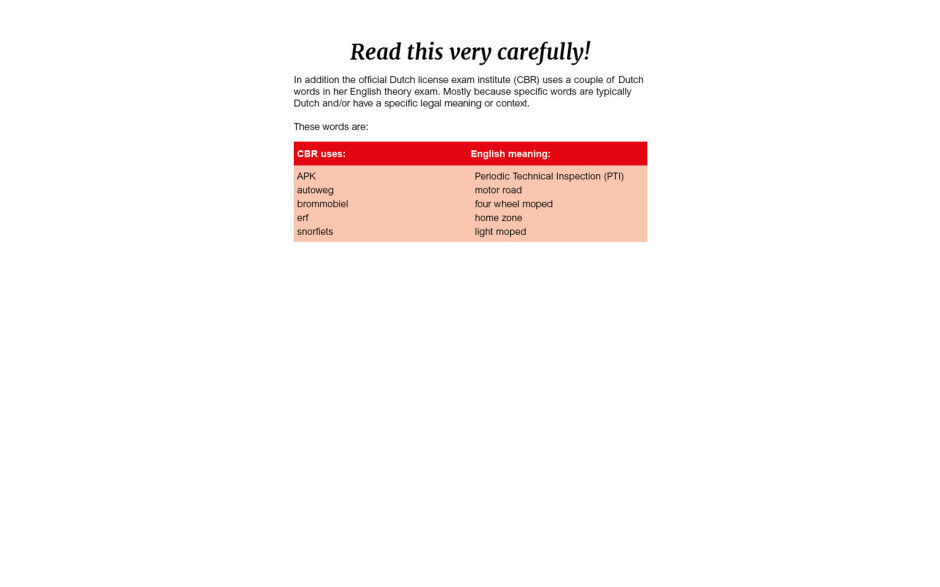 It is logical that high demands are put on your attitude, knowledge and skills before you may drive a car on public roads in the Netherlands. It is not an easy exam at the CBR and it takes a lot of effort to pass. This completely renewed English book will help you to get ready for the exam. It is also helpfull for foreigners who want to drive in the Netherlands and already have a valid driving licence.