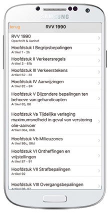 In de app zijn alle artikelen van het RVV1990 (Reglement Verkeersregels en Verkeerstekens 1990) opgenomen. Bij de artikelen is geen toelichting vermeld.